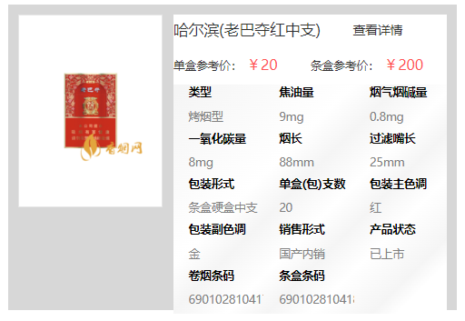 哈尔滨老巴夺红中支香烟产品简介